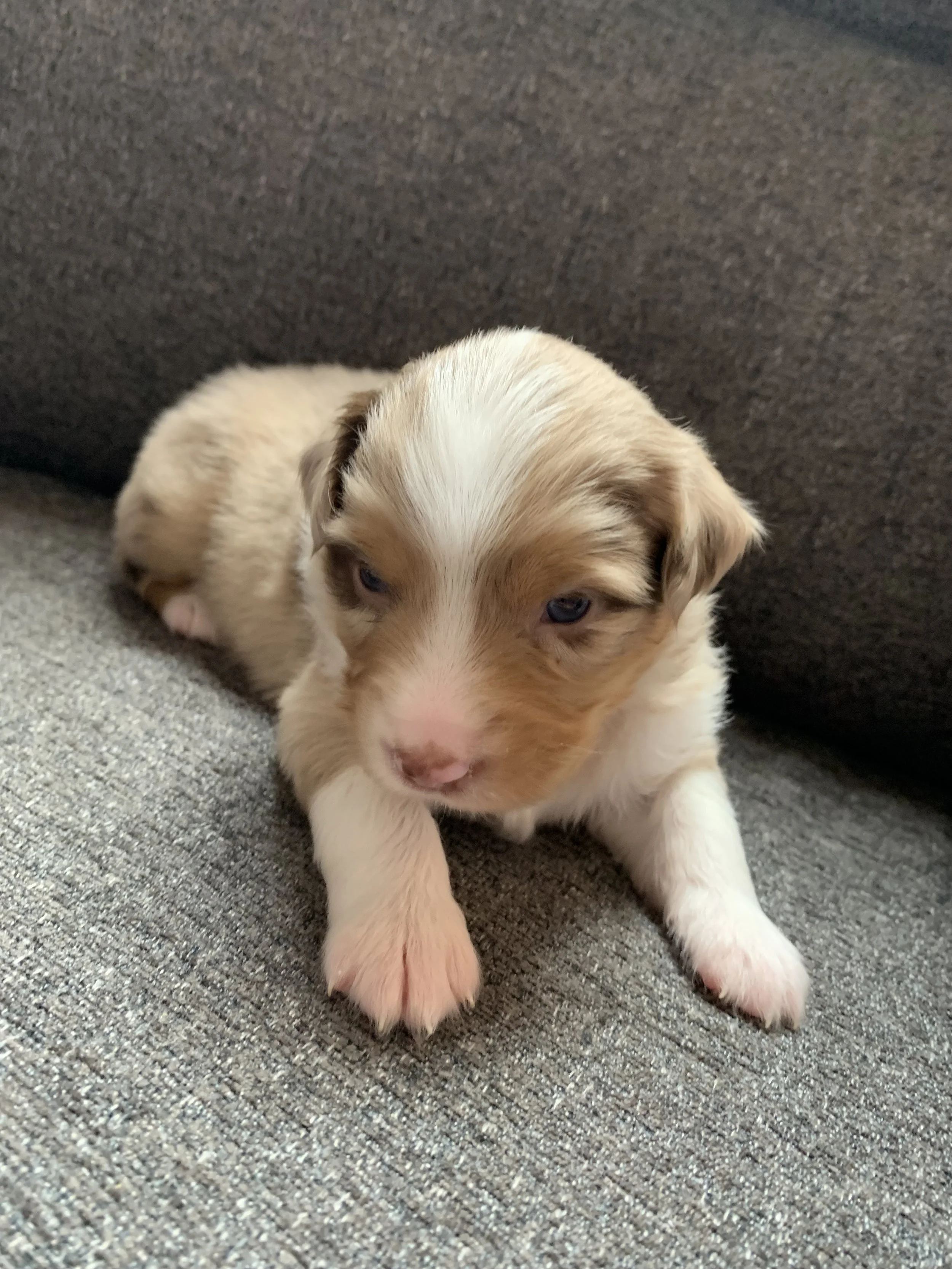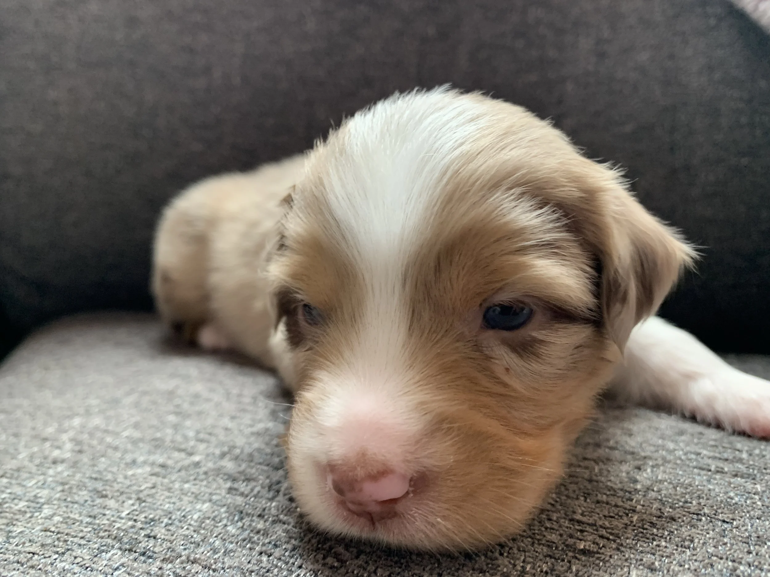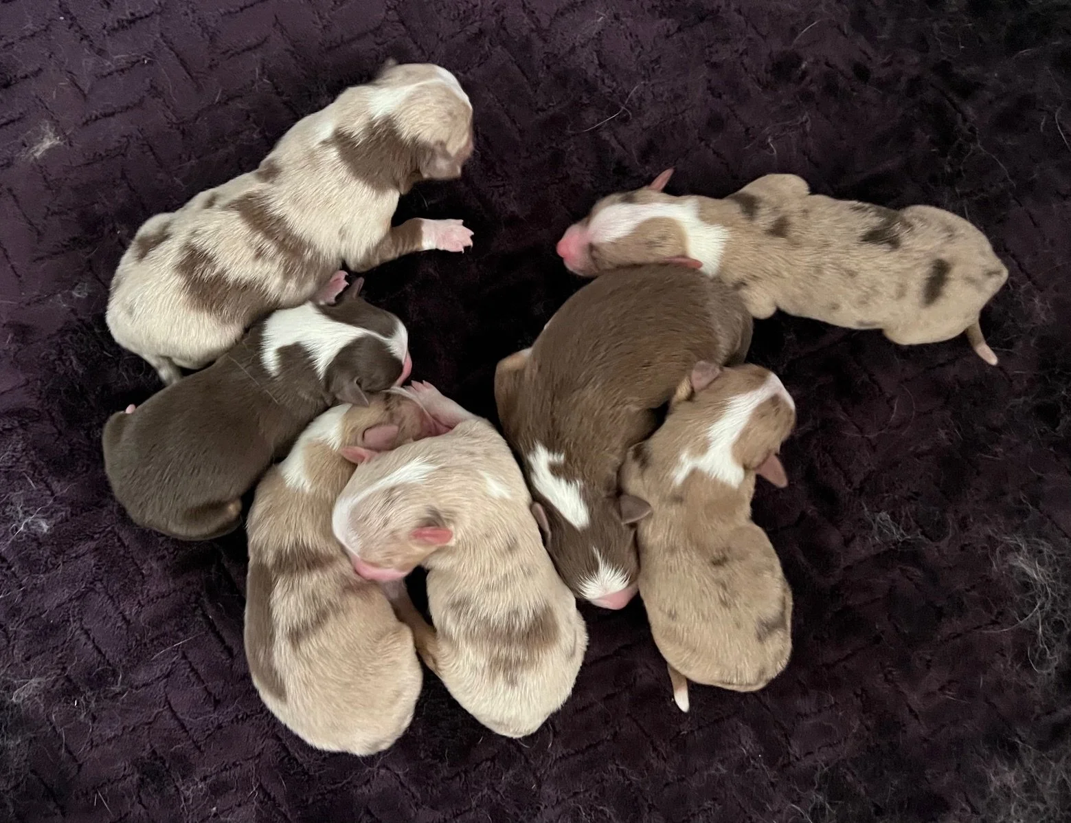 Ginger had 7 healthy pups on May 9th! Only 1 boy among them. 2 red tri’s, 1 with a dark red coat. The rest were red merles with beautiful in standard patterns.